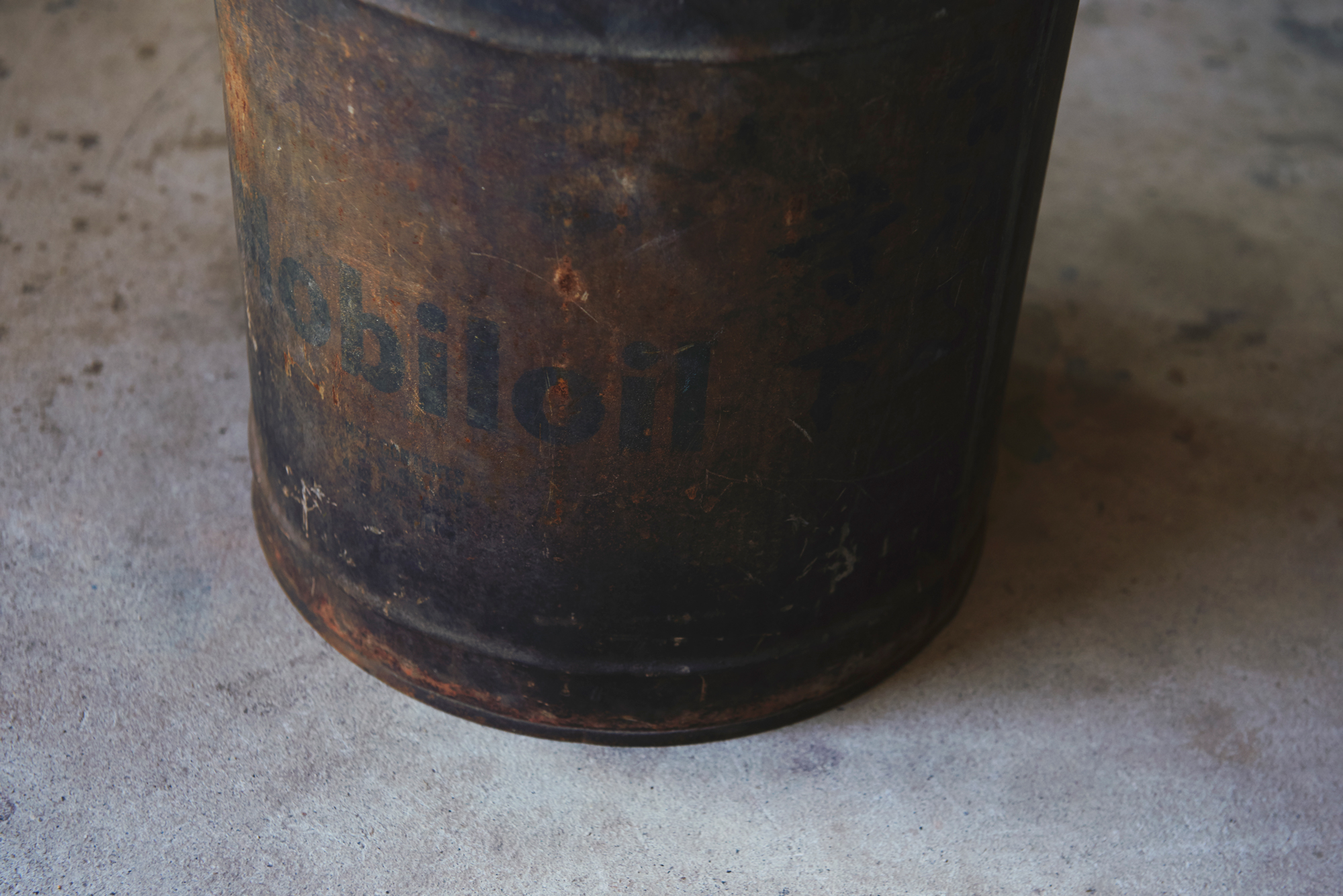 ビンテージのオイル缶です。表面にはmobiloilと印字されていて、経年によりなんとも言えない渋い色合いにエイジングされてます。日本で使用されていたもので印字されたロゴとは別に手書きで漢字が書かれています。なんといっても、ハンドルは木で作られています。目視できる穴はありませんが、古いものですので容器としての使用はおすすめしません。ドライフラワーなんかとも相性よさそうです。