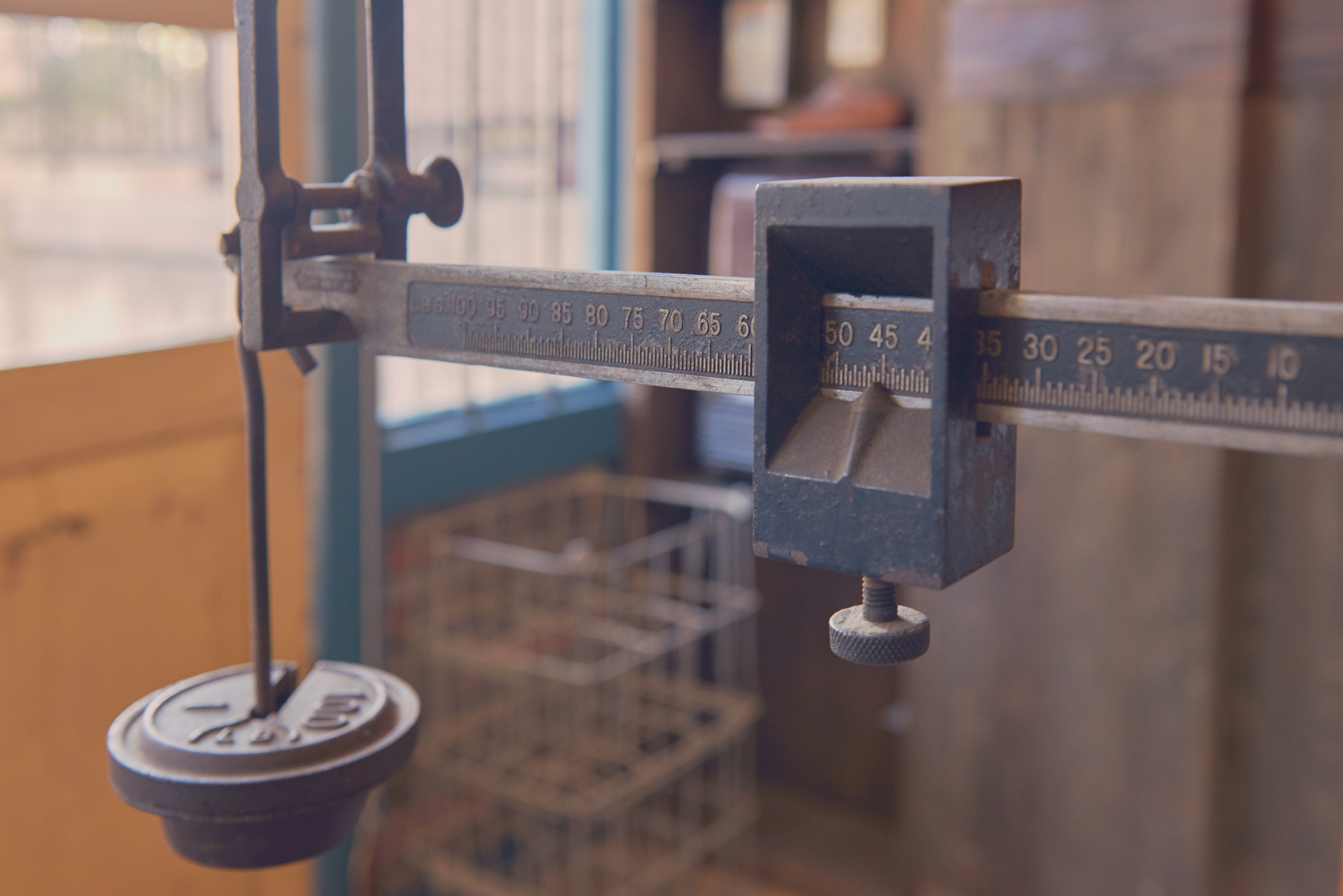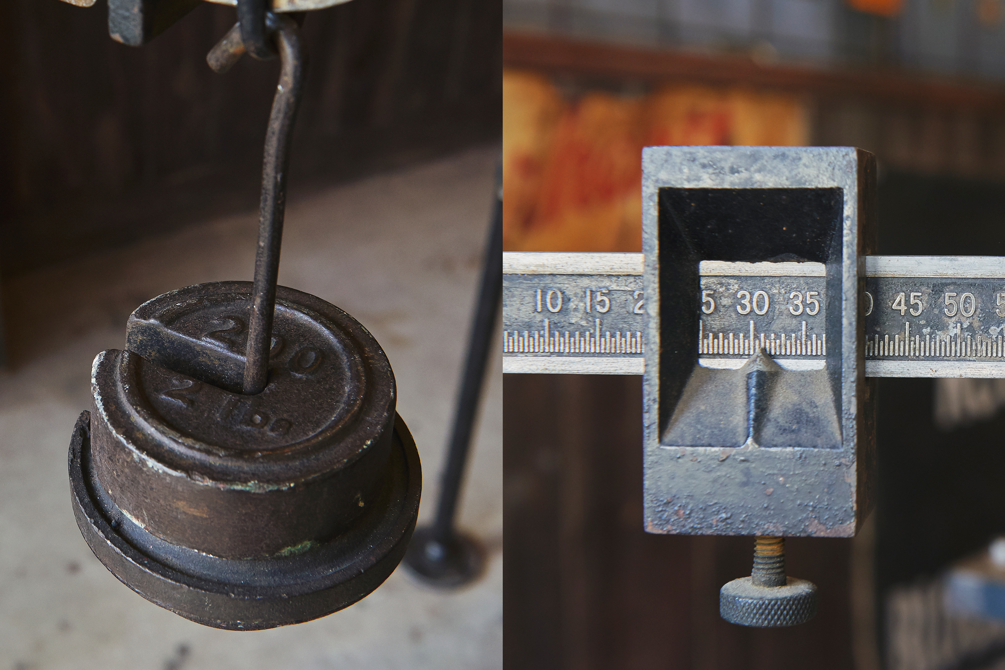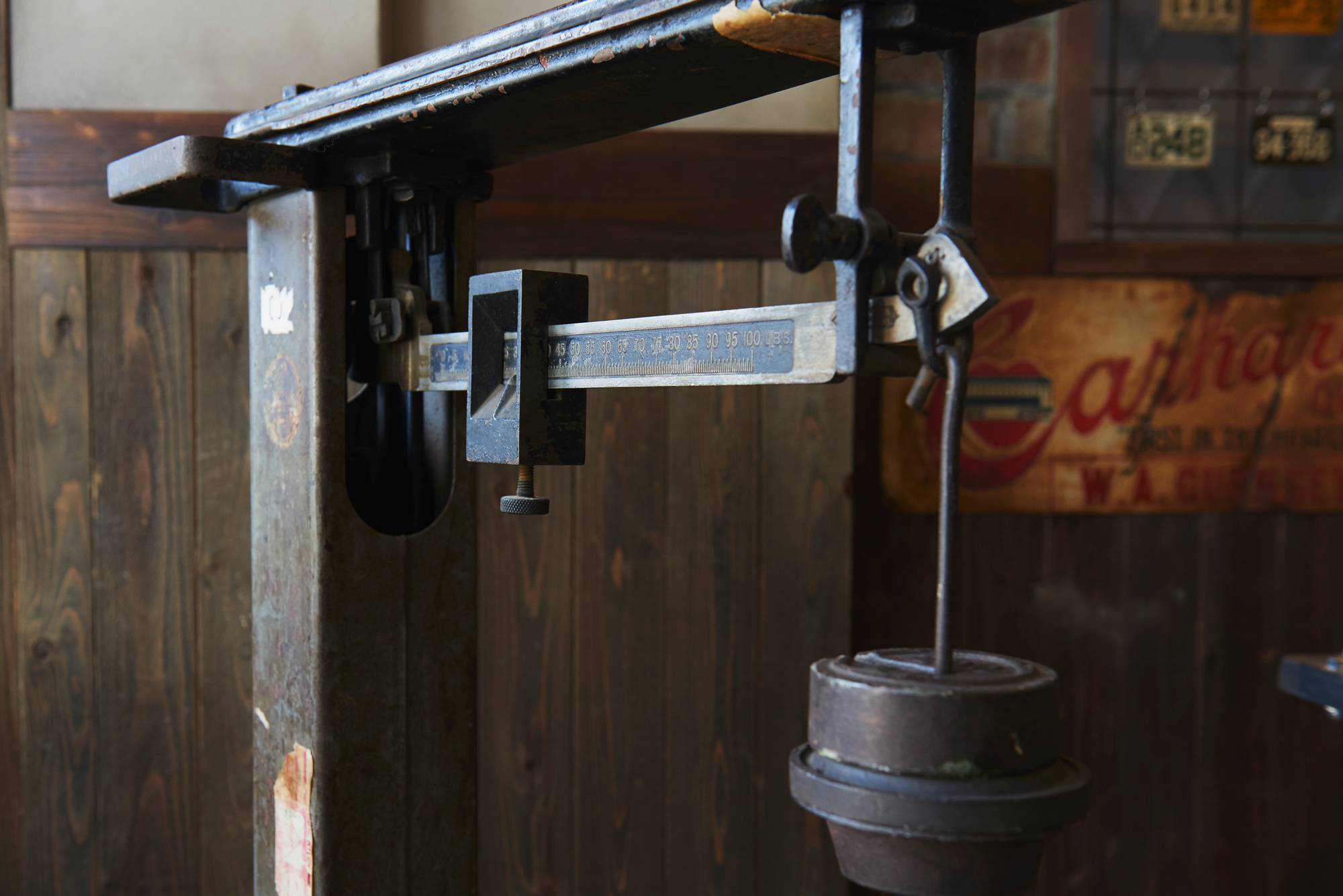 鉄製の台秤です。鉄で作られているので結構な重量と存在感があります。実際に使用されていたものなので傷汚れ、錆びつき、シール跡等ありますが、これらはもちろん、新品にはない経年による味わいです。付属する重りプレートは2枚だけなので実用としては厳しいですが、ディスプレイ用にどんなものでもどーんと引き受けてくれる器の大きさがこの台座には、あります。たよれるかっこいい什器になるはずです。