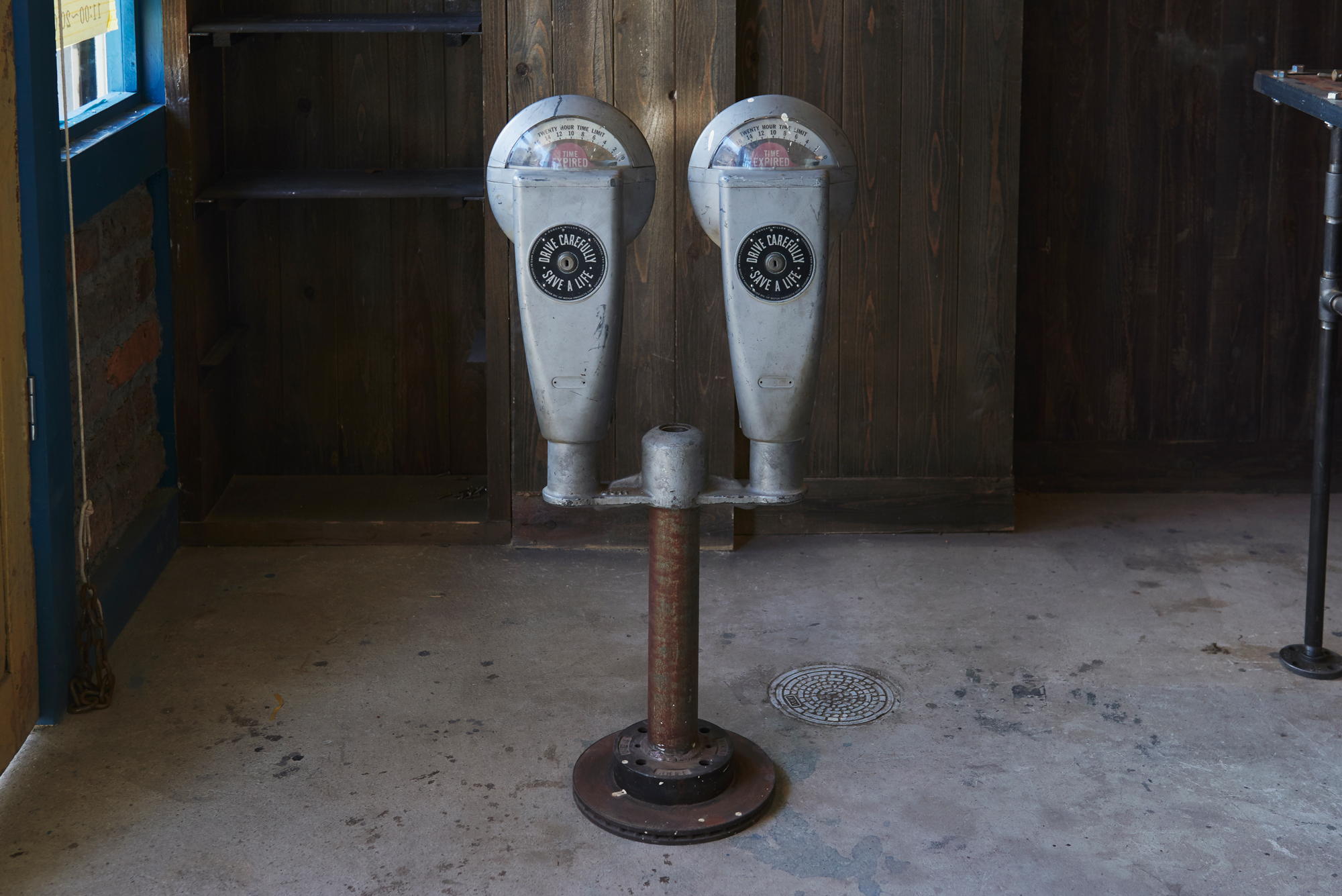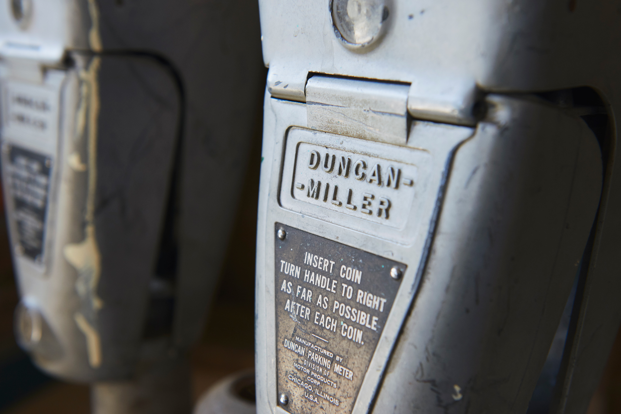 Duncan Miller(ダンカンミラー)社製の脚付きパーキングメーターです。実際に使用されていたものですが、足部分は後付けされたものになります。コンディションは傷やサビ、ペンキ跡などがなんともいえない感じの味わいに。開閉部分の鍵が掛かっておらず開いたままになるのはご愛嬌で。