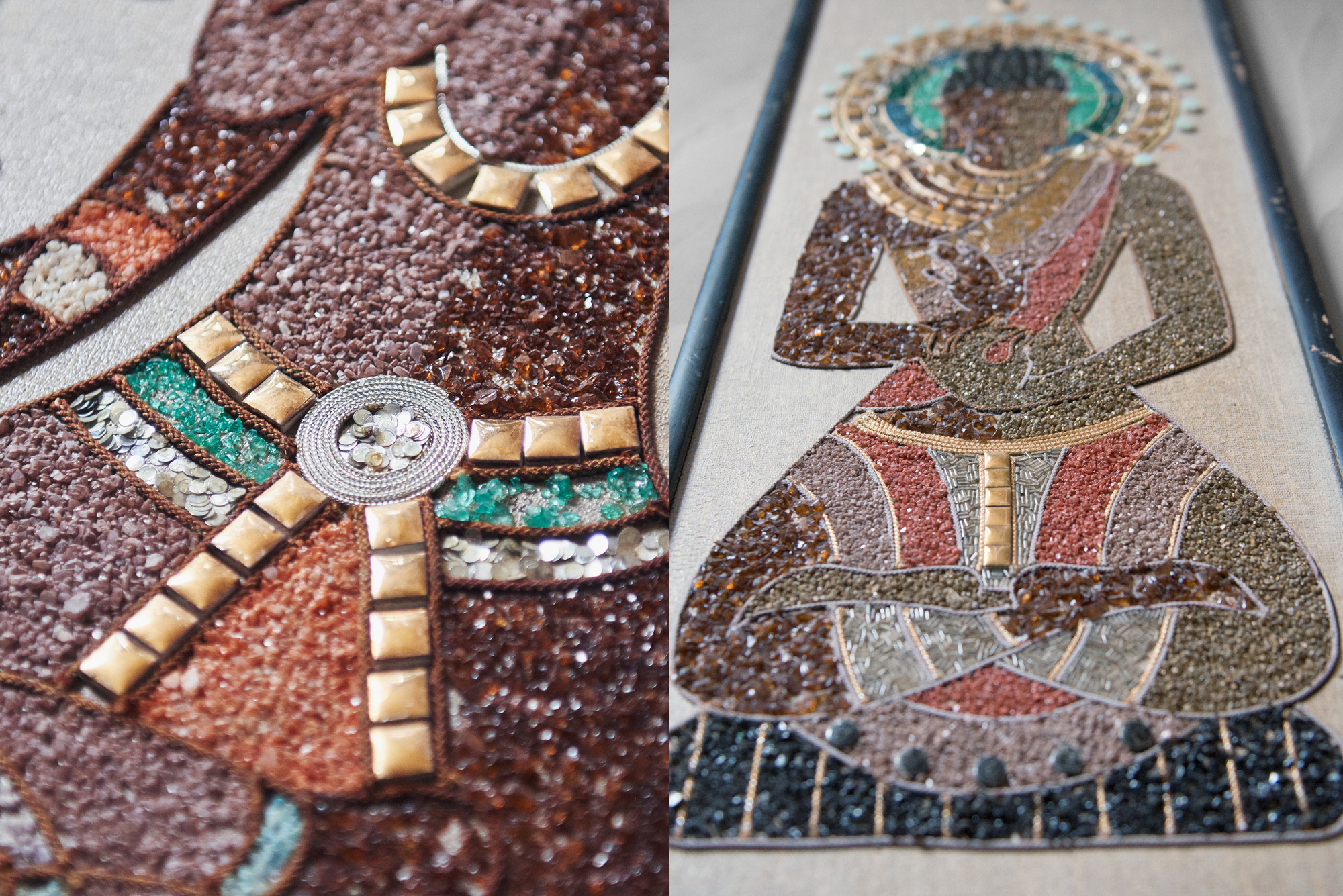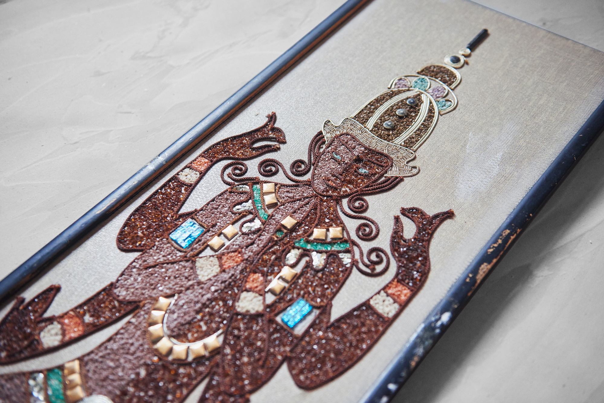 オリエンタルをモチーフにした壁飾りです。布地に様々な色形の砂岩を使ってブッダの姿が細かく丁寧に描かれています。なんだか見ているだけで心が癒されるようです。コンディションは両端にある木枠部分の傷と一箇所だけタイルの剥がれがあります。価格は2枚セットの価格になります。2枚を対で飾るとすごく映えますよ。