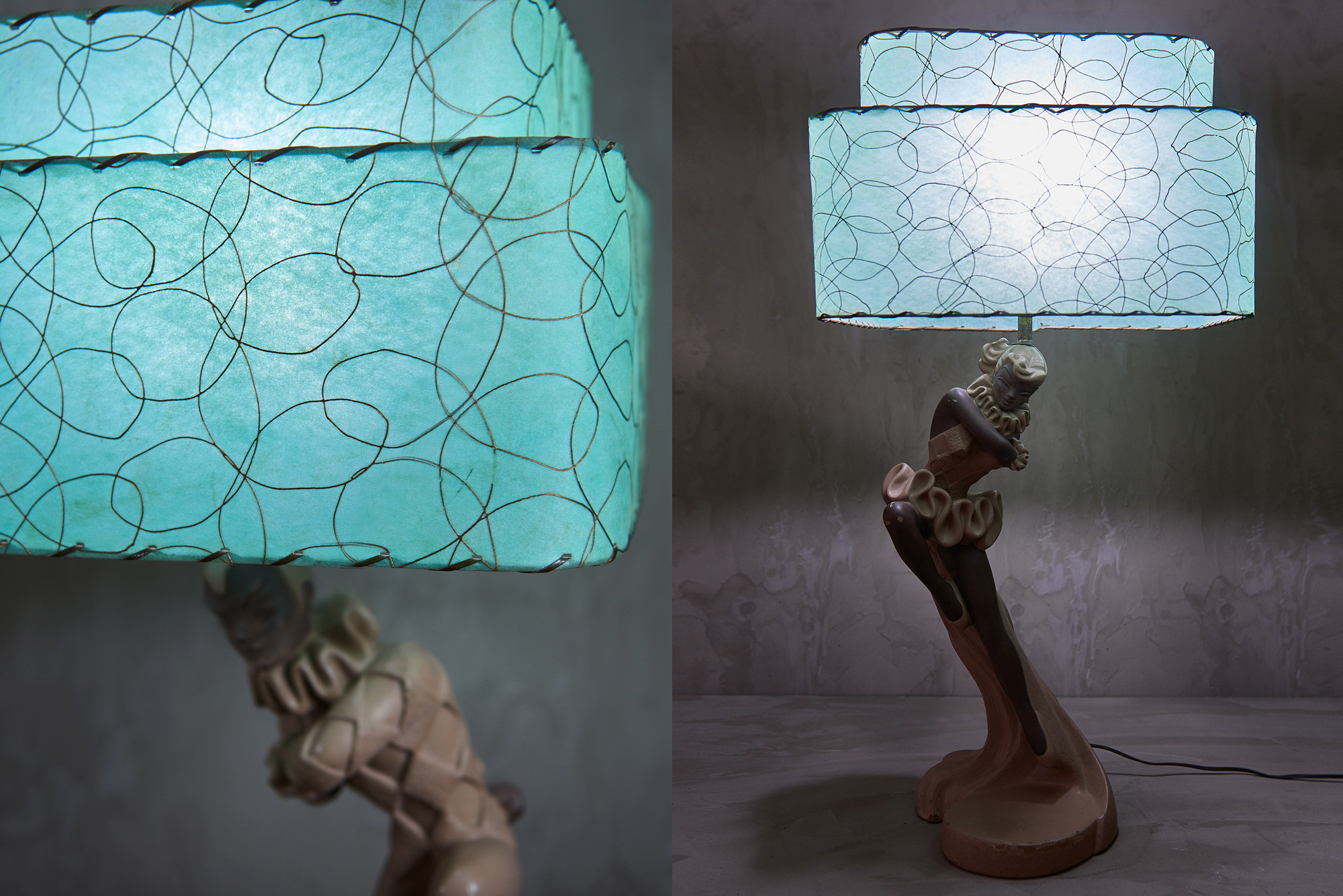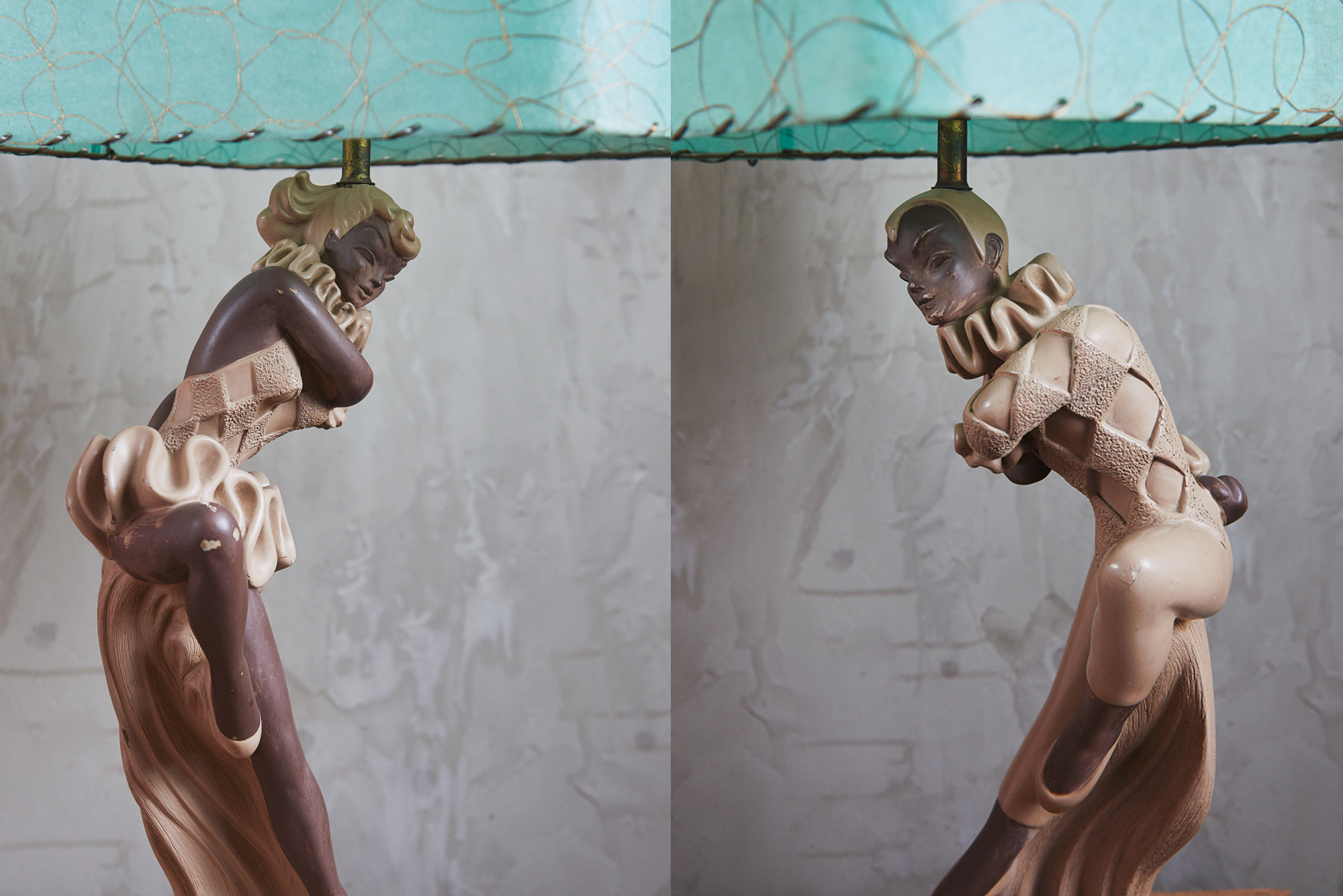 50年代アメリカの代表的なアイテムのひとつである『ハーレクイン』をモチーフにしたランプセットです。こちらは男女の対になっていて、モチーフに動きがあるこの躍動感はハーレクインならではですね。色味をおさえたベース部分に、綺麗なエメラルドグリーンのダブルシェードがいいアクセントになっています。この年代に作られたものでコンディションのいいものは年々数が少なくなってきているのでコレクターの方は必見ですね、2つ対で飾ると本当にいい感じですよ。※電球は付属しません。