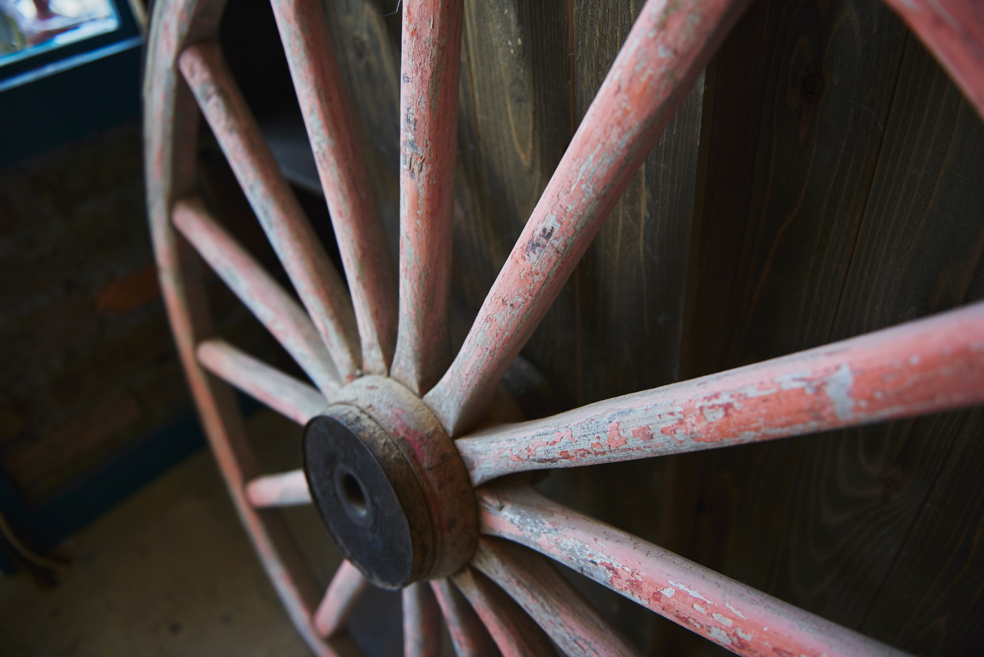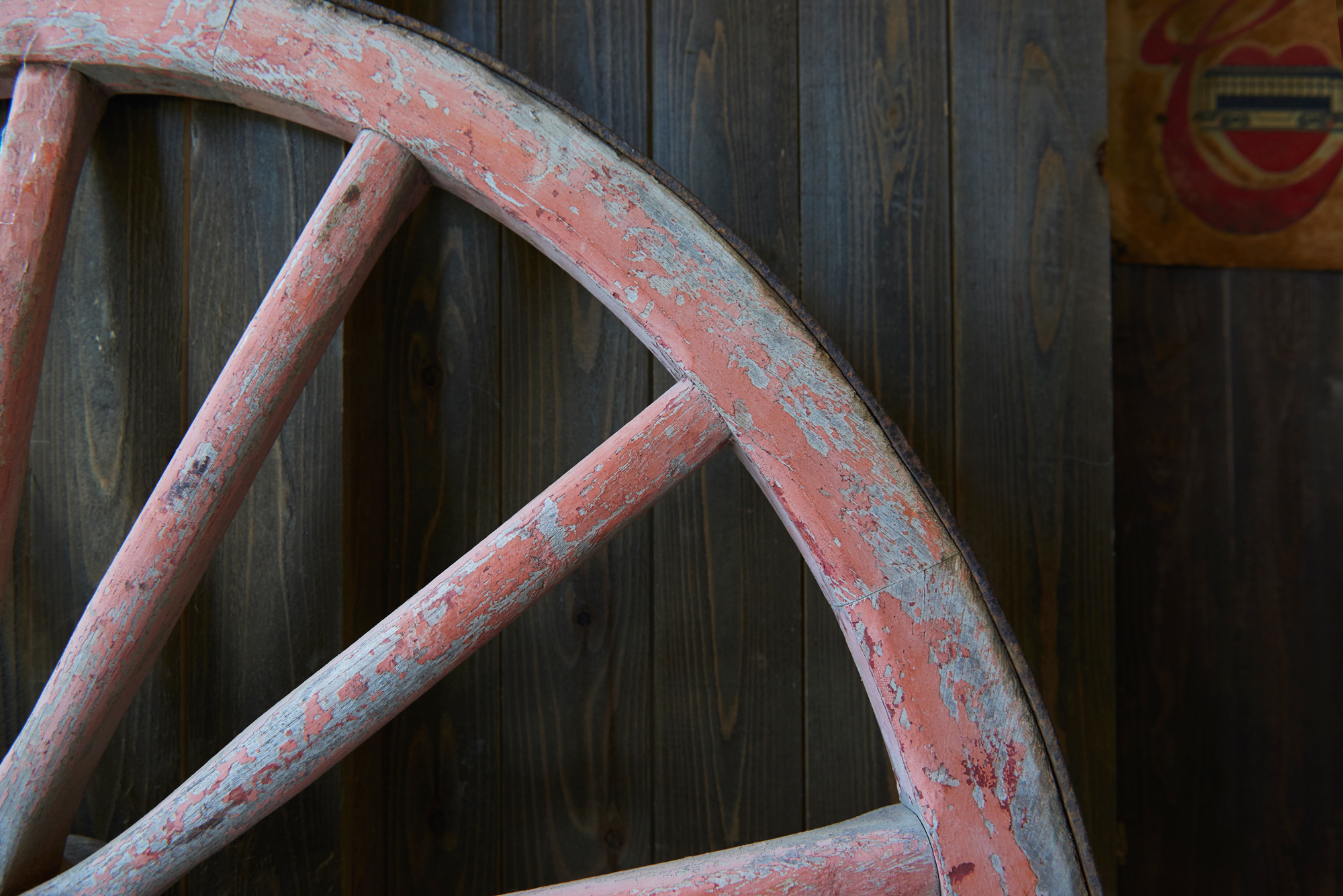 木製の荷車の車輪です。とても古いもので外輪部分の鉄板に錆びがあります。木で作られた部分にはうっすらと塗装が残っていて全体的にシャビィな雰囲気を醸し出しています。とても大きいものなので広い空間に置いても、結構な存在感があります。庭や玄関先、お店の看板替わりにといろんなところで使えそうです。