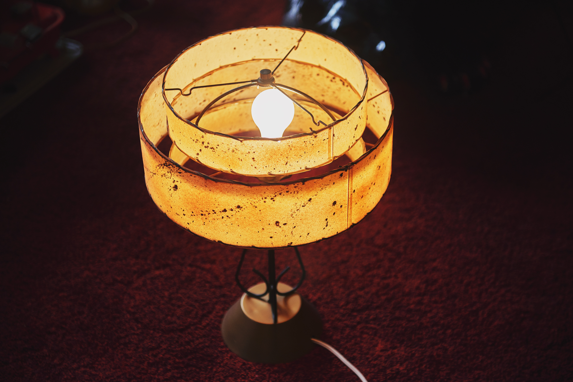 50年代に作られたビンテージのテーブルランプです。ベース部分はゴールドカラーの円形台座に細い3本のアイアンを組合わせて作ってあり、シンプルながらユニークなデザインで50年代の雰囲気を醸し出しています。小ぶりなサイズ感の三段シェードも筆墨がはねた跡の様な絵付けがされていて小さいながらも存在感抜群です。スイッチチェーンもエイジング具合がいい感じです。大きさ的には比較的小ぶりな感じでサイドテーブル等に丁度いいサイズかと思います。※電球は付属しません。