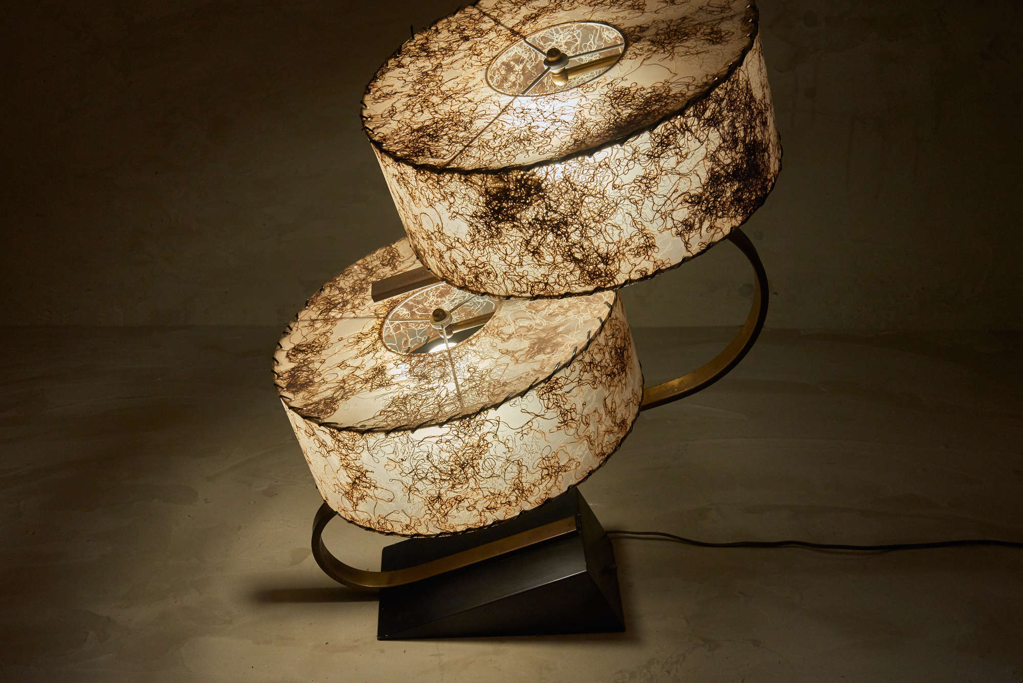 50年代に作られたビンテージランプです。ベース部分は美しい弧を描いた真鍮によって作られていて、シンプルで洗練されてたデザインは素敵すぎます。2つあるシェードの形状や配置が絶妙のバランスでどの方角から見ても美しく見える様は、まさにMAJESTIC。こちら少々お値段は張りますが、それだけの価値はある一品だと思っております!コンディションは大きな痛みも無く状態良好です。 価格は2灯セットの価格です。2つ対で飾るとすごく見ごたえがありますよ。※電球は付属しません。