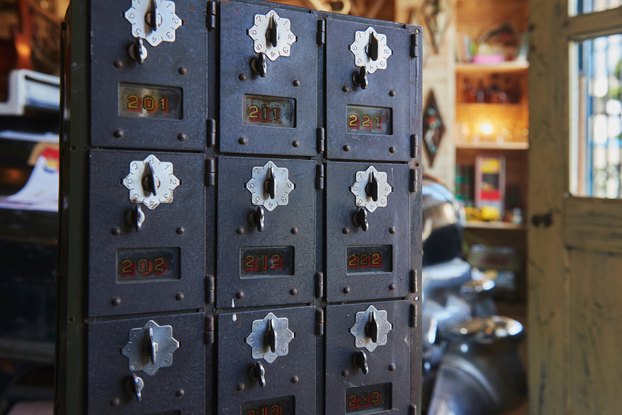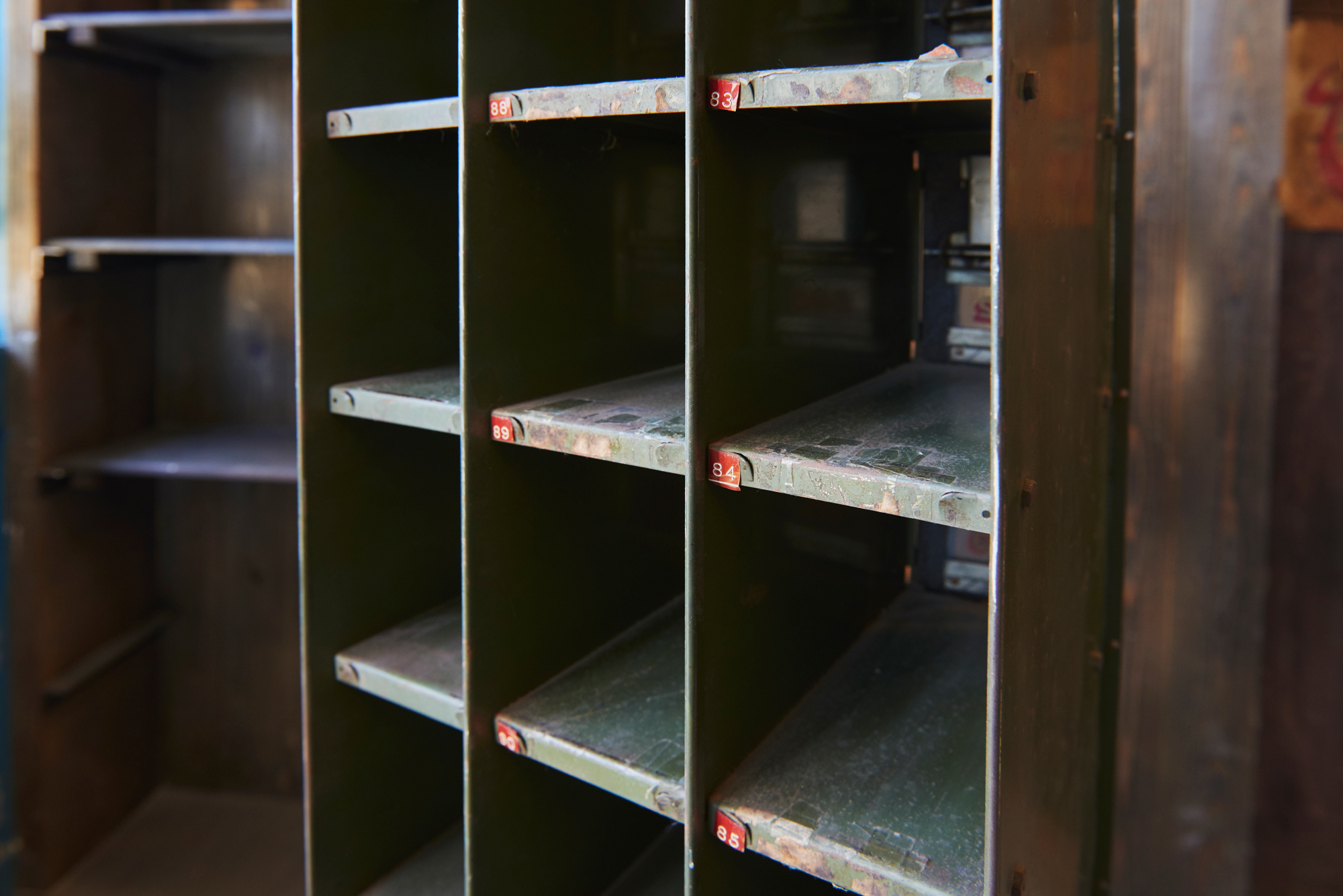 海外で実際に使用されていた私書箱です。日本の私書箱のイメージとは随分違いますね。ナンバーダイヤル部分のフォントやデザインなど、遊び心があり、とてもお洒落な感じです。各扉にふられた番号も、かっこいいです。素材に鉄が使われているので総重量はかなりあります。色も渋みのあるいい色なので、男っぽい部屋のアクセントにいかがでしょう。甘い雰囲気の部屋の引き締めに使うのもいいですよね。