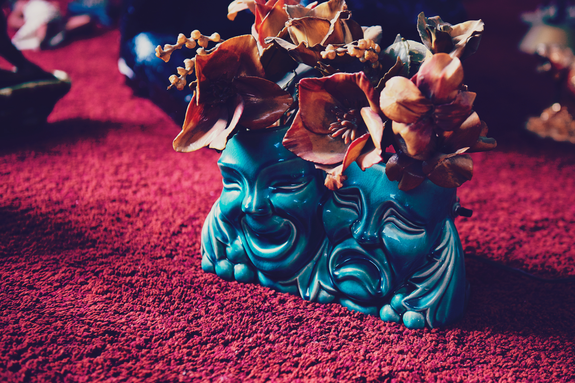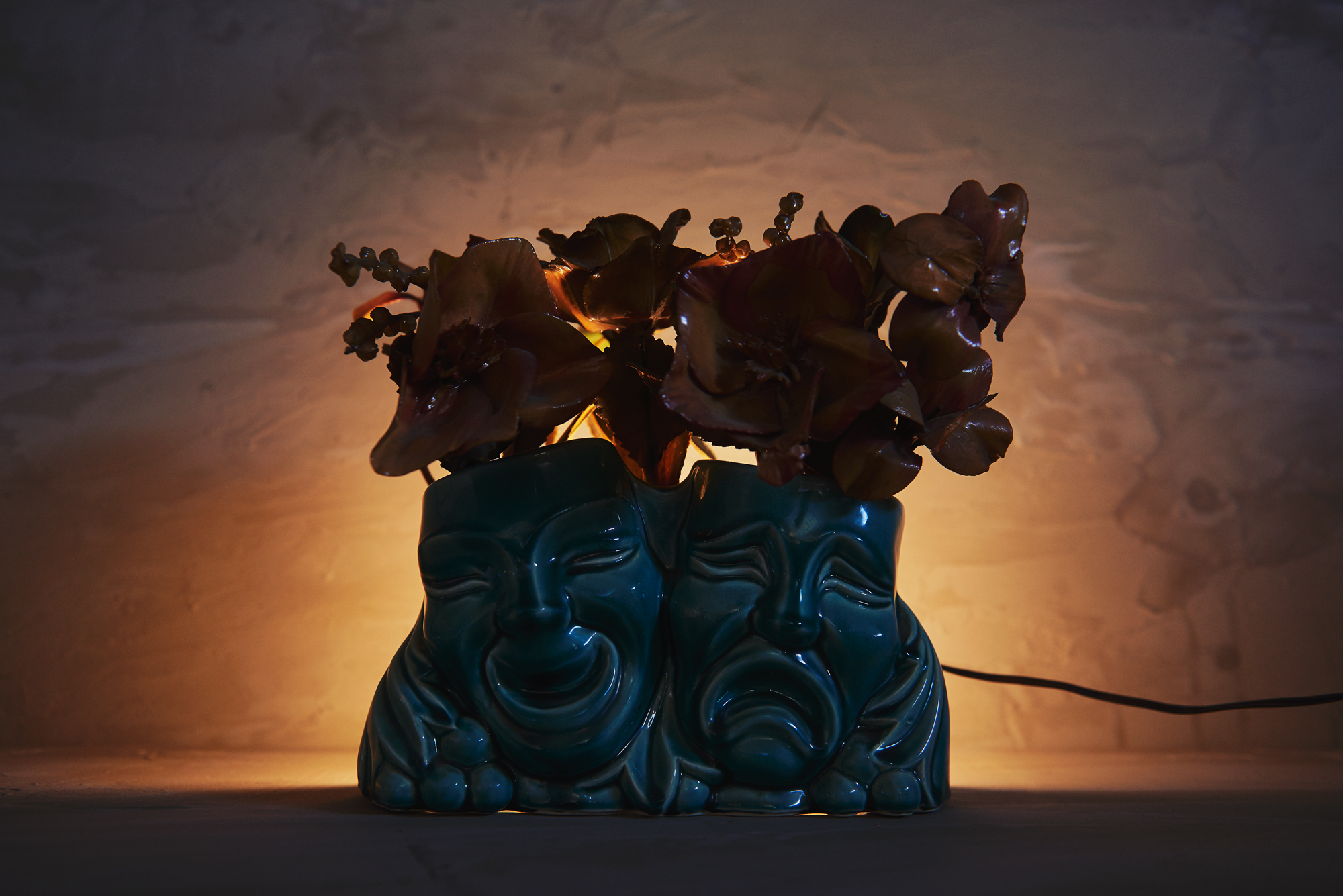 50年代に作られたビンテージTVランプです。50年代を代表するアイテムのひとつであるツーフェイスをモチーフにして作られています。2つ並んだ顔の頭部にはプランターとして使える穴がが空いていて、そこに当時の持ち主が手作りの造花を飾りつけた、世界で一つのTVLAMPになります。やはりツーフェイスのものにはなんとも言えない独特の雰囲気がありますよね。