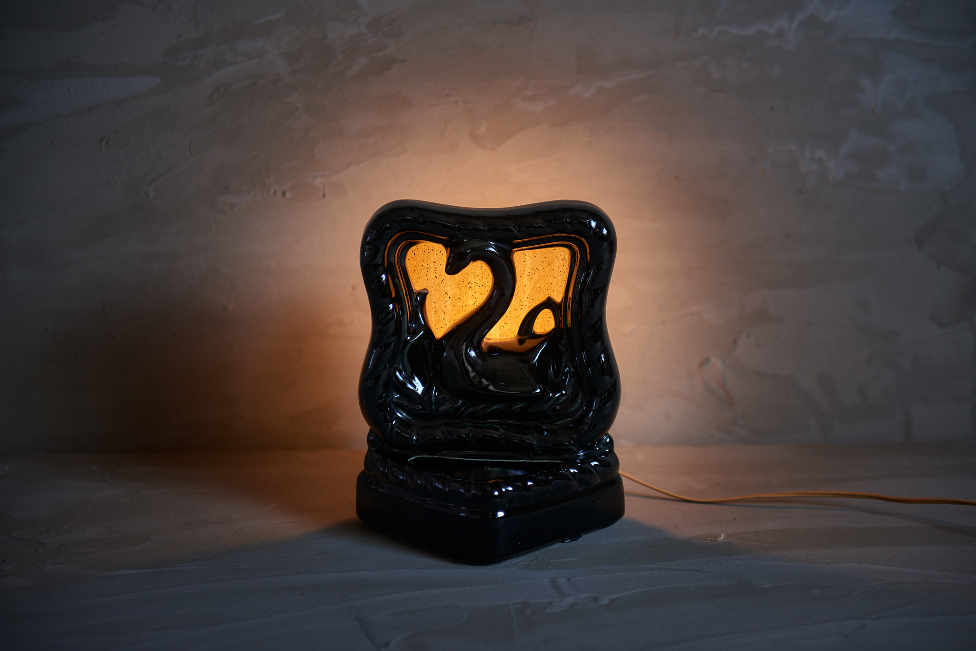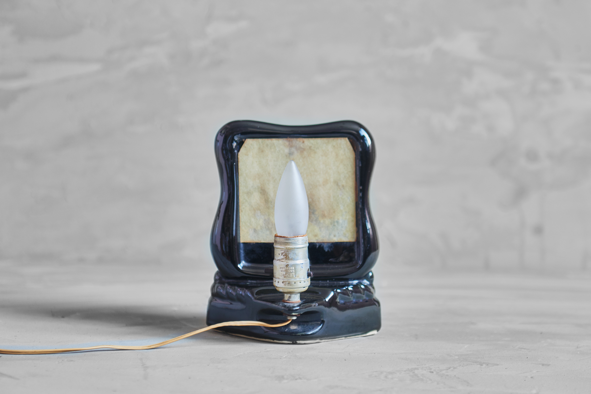 50年代に作られたビンテージTVランプです。こちらは白鳥をモチーフに作られていて、塗りが黒一色でとっても50sらしいクールなデザインになっています。台座部分にポケットがありプランターとして使えるようになっています、もちろん小物入れとしても使えます。裏側に貼り付けてあるファイバーグラス製のシェードが点灯時にブラックスワンのシルエットをとっても魅力的に浮かび上がらせてくれますよ。壁際への設置がおすすめです。