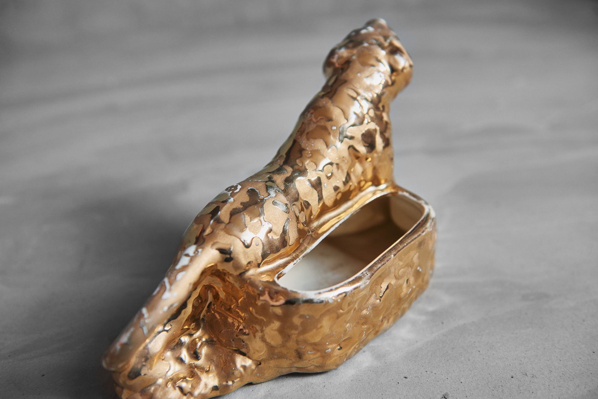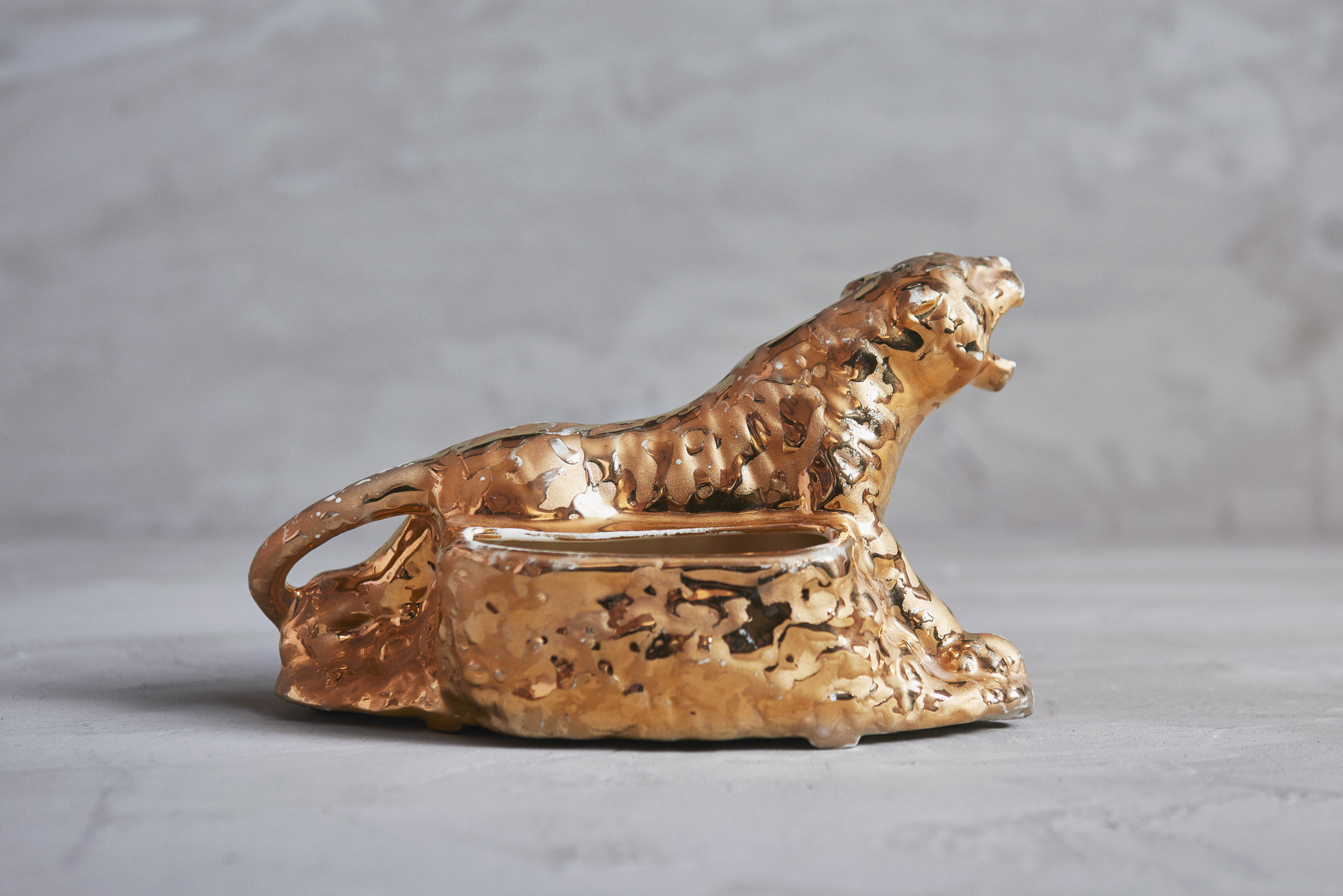 50年代に作られた飾りプランターです。この年代に流行したパンサーをモチーフに作られています。こちらはなんと24金をつかって絵付けされております。金色の塗装が流行った年代ですがこれは贅沢ですね。裏側部分にはプランターポお部屋やお店の雰囲気作りにいかがでしょう。