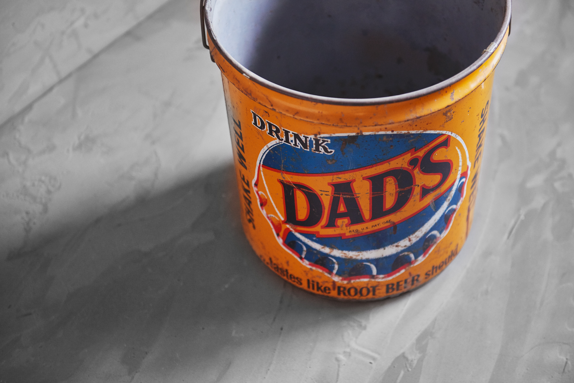 DAD'S(ダッズ)とはアメリカ生まれのソフトドリンクのメーカーでこちらは一番の売りであるROOT BEERのボトルキャップが描かれた缶です。黄色と青で色つけされ、とってもポップな外観になっていますのでかなり目立ちます。50年代に作られたモノで傷やサビございますがそれらも味わいと感じていただければと思います。大きく目立つ痛みはありませんので、実用品として使っていただくことも可能かと思います。